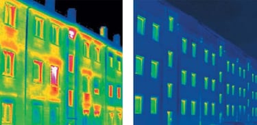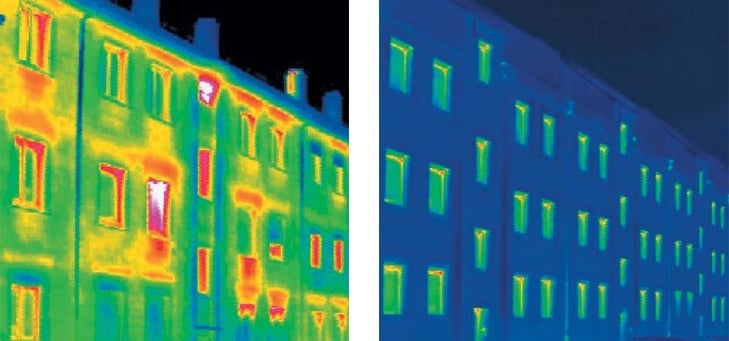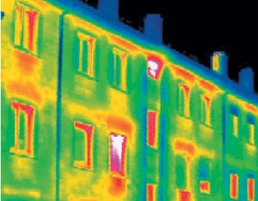 La thermographie est souvent appliquée au bâtiment par voix aérienne pour analyser les déperditions thermiques des bâtiments à l’échelle d’un territoire ou plus localement pour l’analyse de fuites de calories à l’échelle d’une pièce, d’un logement ou de locaux techniques. Elle permet de rendre visible les déperditions de chaque bâtiment grâce à un thermogramme et à une échelle de couleurs, qui peuvent servir à produire des cartes. En moyenne, 44 % des déperditions thermiques d’un bâtiment s’effectuent par la toiture, 37 % par les murs et 19 % par les vitres. Elle peut aussi mettre en évidence des défauts d’isolation .
